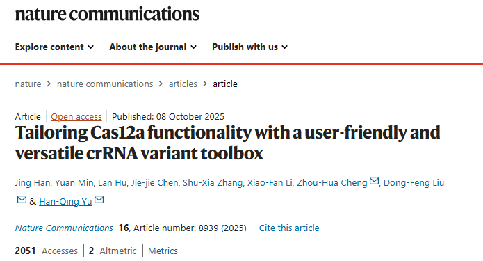 2025年10月8日,中国科学技术大学俞汉青、刘东风、程洲华在Nature Communications 发表题为“Tailoring Cas12a functionality with a user-friendly and versatile crRNA variant toolbox”的研究论文,提出一种简洁高效的策略:通过系统性突变crRNA直接重复序列(DR),筛选出系列功能各异的crRNA突变体,并将其整合为crRNA工具箱以实现Cas12a活性的灵活调控。