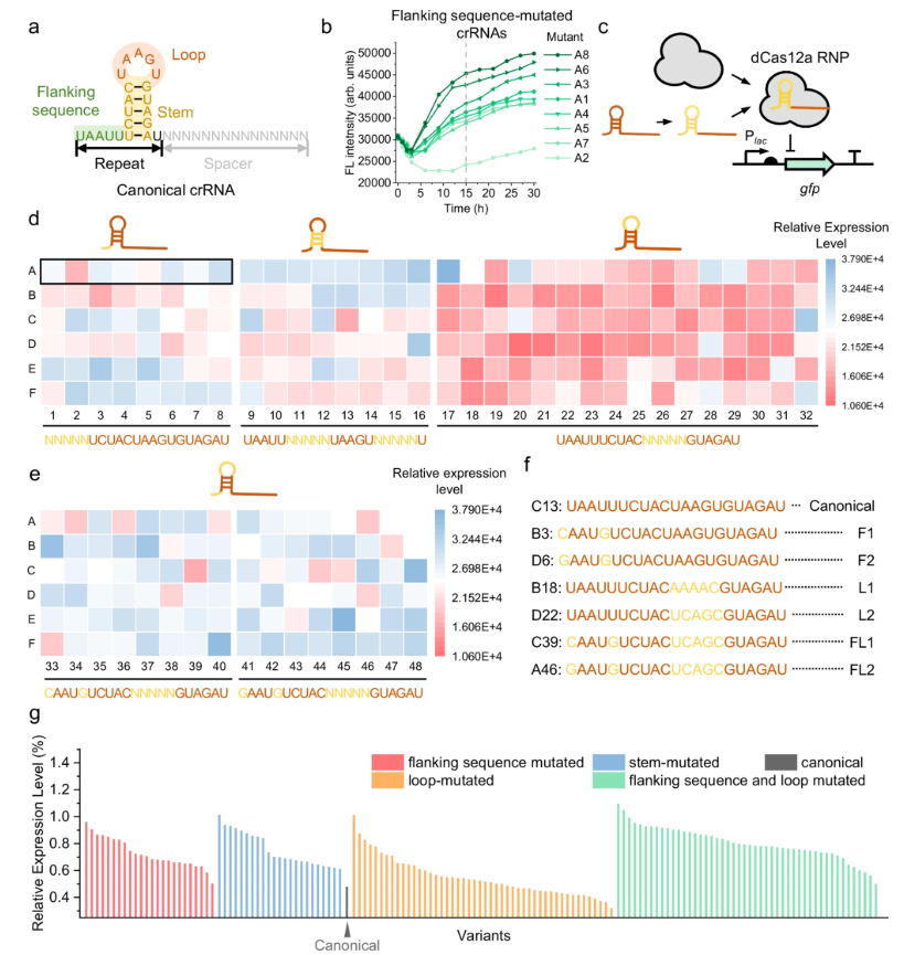 Cas12a crRNA的DR具有短茎环状结构,这对其稳定性和Cas12a识别至关重要(图1a)。同时利用crRNA引导DNase-dead Cas12a(dCas12a,D832A)23为了抑制绿色荧光蛋白(GFP)的表达,我们意外地观察到crRNA侧翼序列的突变导致荧光表达水平的变化(图1b 和补充图)。这一观察结果表明,Cas12a 活性可以通过 DR 序列的靶向改变来有效调节。此类突变可能会影响 RNA 构象,扰乱 Cas12a-crRNA 相互作用,从而影响 Cas12a-crRNA 核糖核蛋白 (RNP) 的整体功能。为了探索这种可能性,我们将DR序列分为三个部分——茎序列、环序列和侧翼序列——并在每个部分分别构建饱和突变体文库。