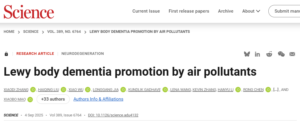 2025年9月4日,约翰·霍普金斯大学医学院毛晓波、Ted Dawson、韩士忠及纽约哥伦比亚大学吴晓共同通讯(第一作者为张晓笛、刘海清、吴晓、贾龙刚)在Science 在线发表题为“Lewy body dementia promotion by air pollutants”的研究论文,该研究在美国5650万人的队列中显示,细颗粒物(PM2.5)暴露会增加LBD的风险。