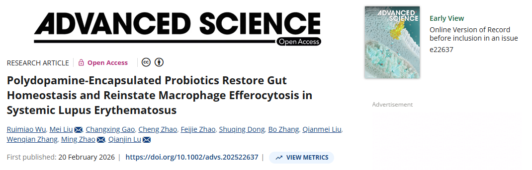 2026年2月20日,中国医学科学院陆前进团队在Advanced Science(IF=14.1),上发表题为"Polydopamine-Encapsulated Probiotics Restore Gut Homeostasis and Reinstate Macrophage Efferocytosis in Systemic Lupus Erythematosus"的论文,该研究发现确立了LGG@PDA作为一个生物工程益生菌平台的地位,将微生物群调节与免疫调控相结合,凸显了L-蛋氨酸作为关键代谢介质,以及一种有前景的基于微生物群的SLE治疗策略。