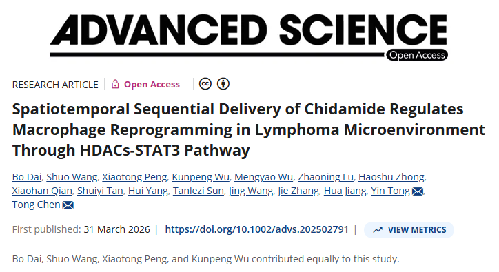 2026年3月31日,复旦大学陈彤及上海交通大学童茵共同通讯在Advance Science上发表题为"Spatiotemporal Sequential Delivery of Chidamide Regulates Macrophage Reprogramming in Lymphoma Microenvironment Through HDACs-STAT3 Pathway"的论文,该研究发现组蛋白去乙酸化酶(HDACs)诱导的STAT3脱乙酰化对DLBCL中M2巨噬细胞积累至关重要。