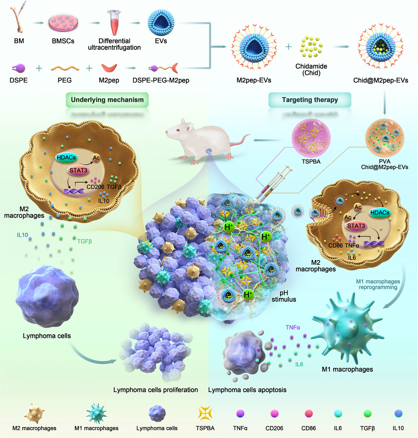 鉴于HDAC抑制剂chidamide在DLBCL治疗中的不可忽视的不良反应,研究团队开发了一种结合肽修饰胞外囊泡(M2pep-EVs)的M2靶向递送系统,以实现最佳的瘤内递送。结合pH响应的水凝胶TSPBA/PVA,将chidamide装载于M2pep-EVs中,并在酸性淋巴瘤微环境中智能释放为原位Chid@M2pep-EV。通过向M2巨噬细胞的靶向递送,chidamide充分抑制了HDACs,增强了STAT3的乙酰化,将M2比例重新编程为M1表型,最终抑制了体内淋巴瘤的生长。通过降低剂量和不良反应,Chid@M2pep-EVs系统为治疗难治性/复发性淋巴瘤提供了新的转化策略。