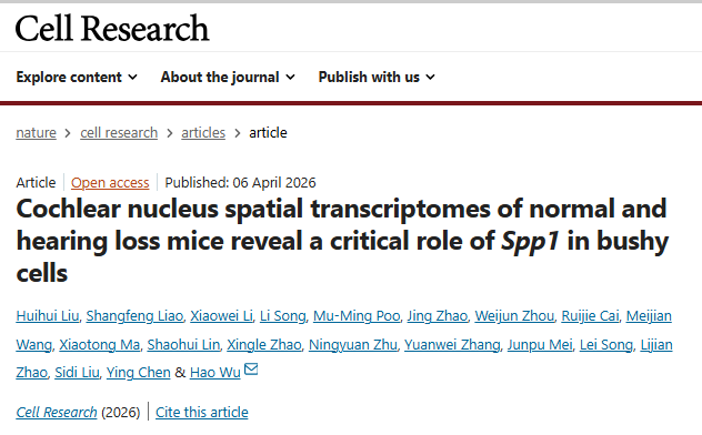 2026年4月6日,上海交通大学吴皓团队在Cell Research上发表题为"Cochlear nucleus spatial transcriptomes of normal and hearing loss mice reveal a critical role of Spp1 in bushy cells"的论文,该研究团队生成了小鼠CN的综合细胞类型图谱,识别了分子定义的CN亚区域,并定量了正常小鼠出生后发育及先天性听力损失突变小鼠基因表达和空间组织的变化。并鉴定出一种表达编码骨藻素基因Spp1的丛状细胞亚型,作为主要CN细胞类型,表现出听力损失引起的基因表达改变。在丛生细胞中受影响极大的基因中,听觉输入调控基因Spp1的缺失影响了小鼠听觉信号的CN处理。这些结果为理解CN内听觉处理及识别潜在治疗目标提供了迄今为止最全面的细胞和分子数据库,帮助理解CN层面的听力恢复。